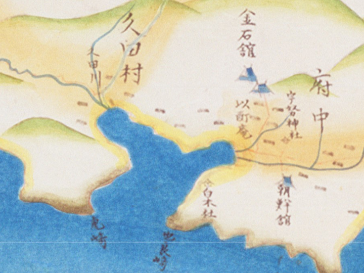 なお、国土地理院が蔵する近世の「対馬国絵図」では、明忍が暮らした府中から久田の近傍、そして明忍がその景色を愛して茅壇からしばしば散歩していたという夷崎の位置関係は以下のように描かれています。